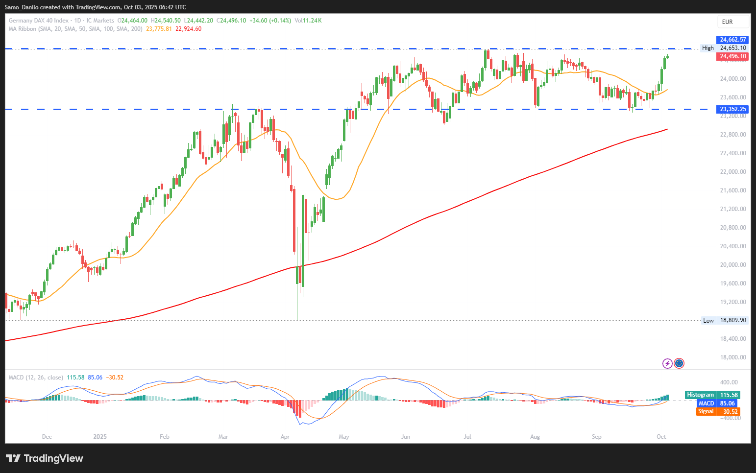- DAX Price: The DAX trades around 24,500 points, up 0.16% on Friday, with potential to set a record high on German Unity Day.