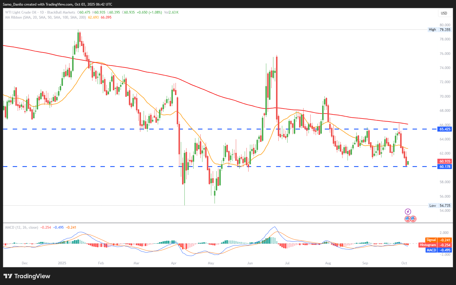 Closing statement: Crude oil remains under pressure, with oversupply risks from OPEC+ and Iraq’s exports weighing on sentiment while demand fears deepen amid the US shutdown. Short-term direction hinges on OPEC+’s production decision and US economic stability.