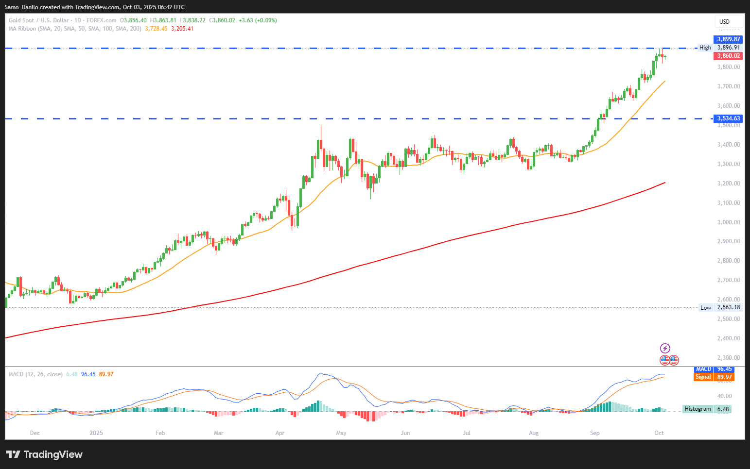 Closing statement: Gold remains in consolidation mode near record levels as investors weigh political gridlock and Fed easing expectations against strong growth and sticky inflation. The absence of labor market data could limit volatility in the near term.