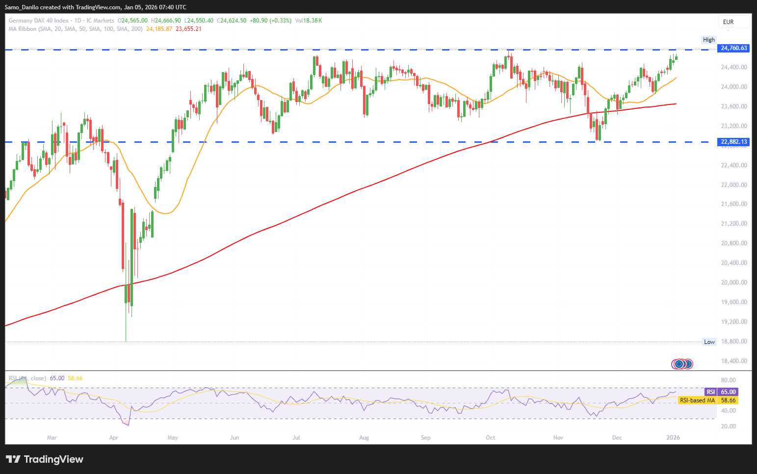 - DAX Price: The DAX continues to grind higher and is trading around 24,650 points, extending its advance toward the October record high near 24,771 points.