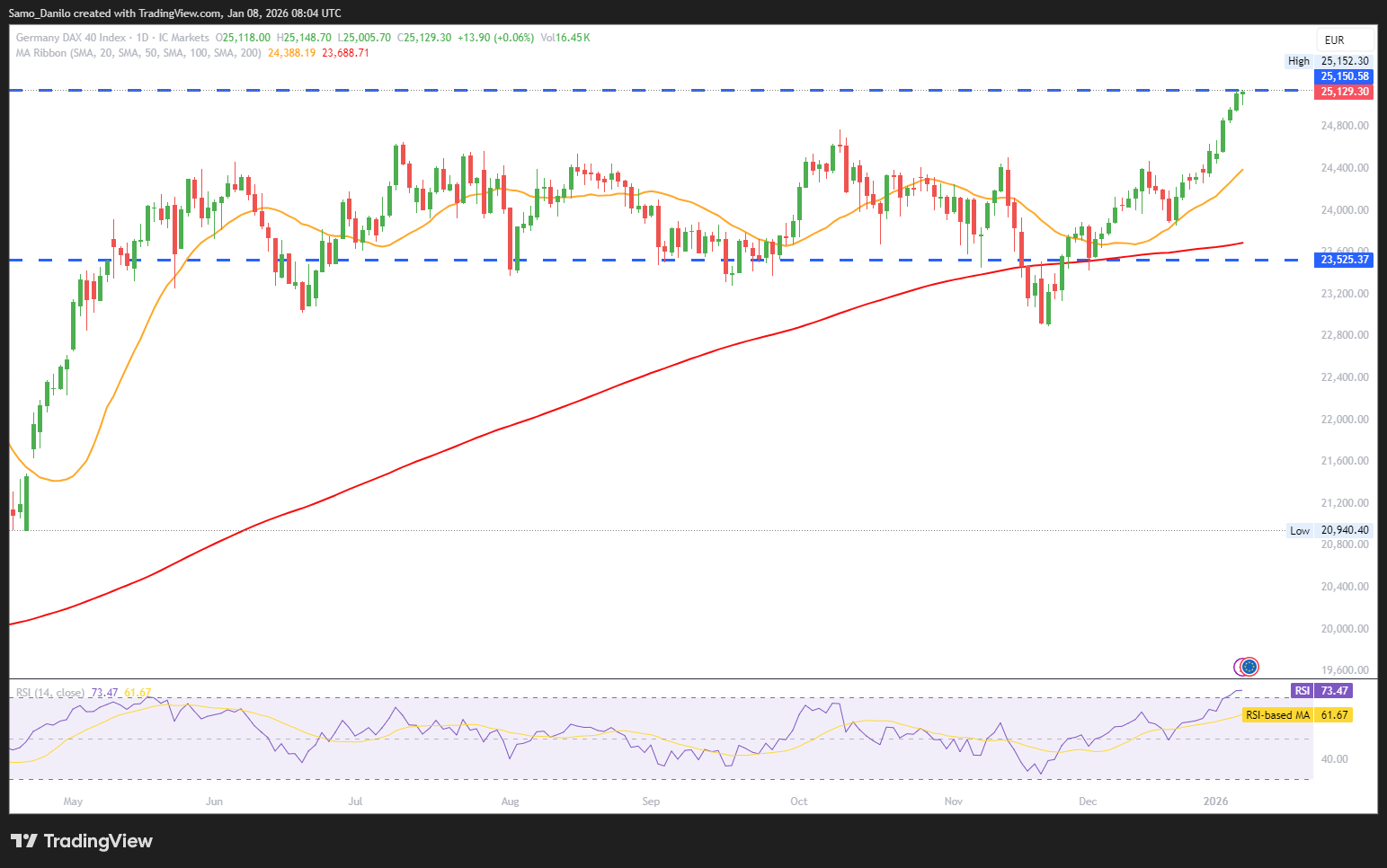 - DAX Price: The DAX is trading slightly lower around 25,130, pausing after printing fresh all-time highs near 25,150, suggesting near-term consolidation rather than a trend reversal.