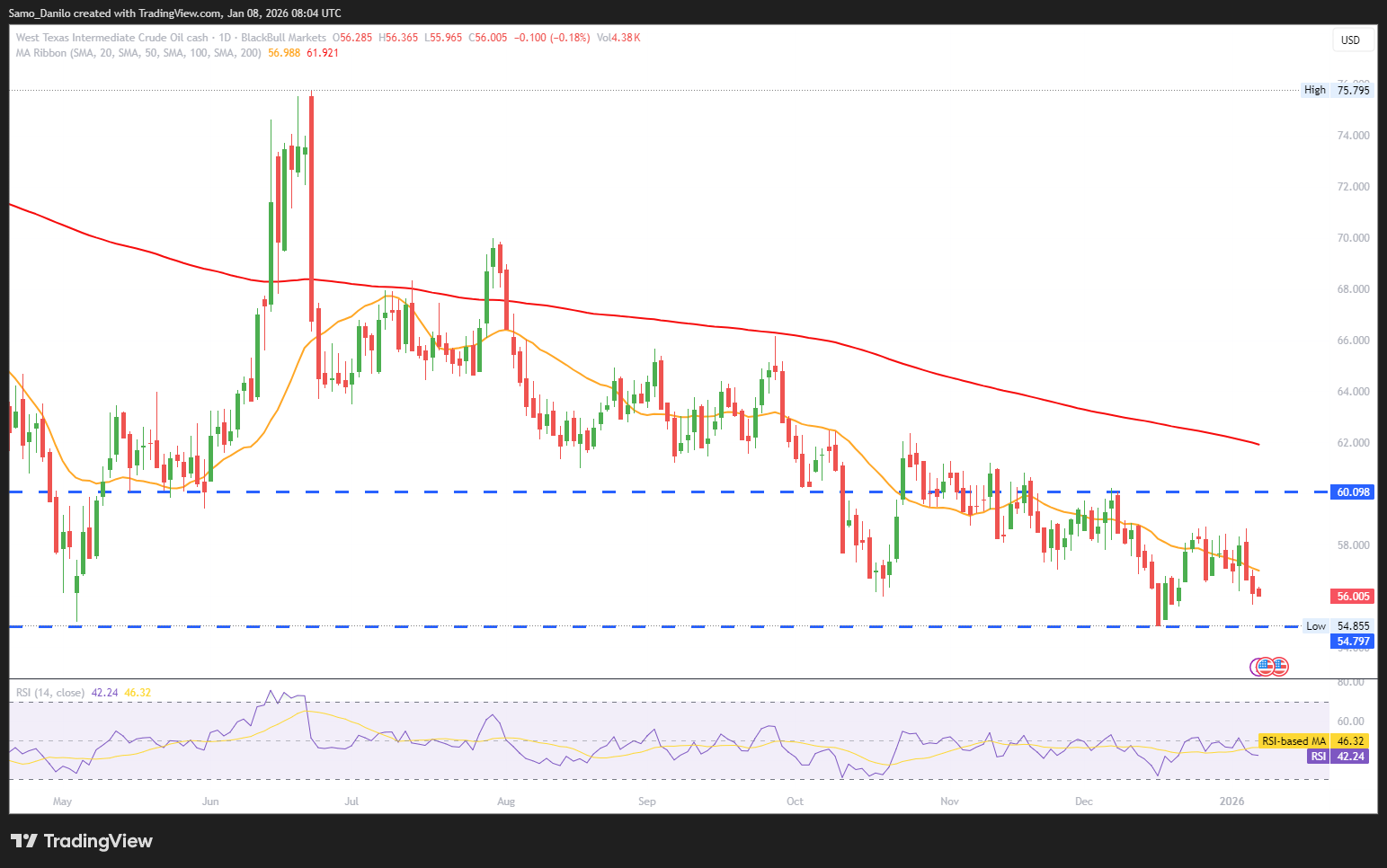 - Crude Oil Price: WTI trades softer around $56.05 in early European hours, reflecting persistent supply-side concerns and a fragile demand outlook despite some supportive inventory data.