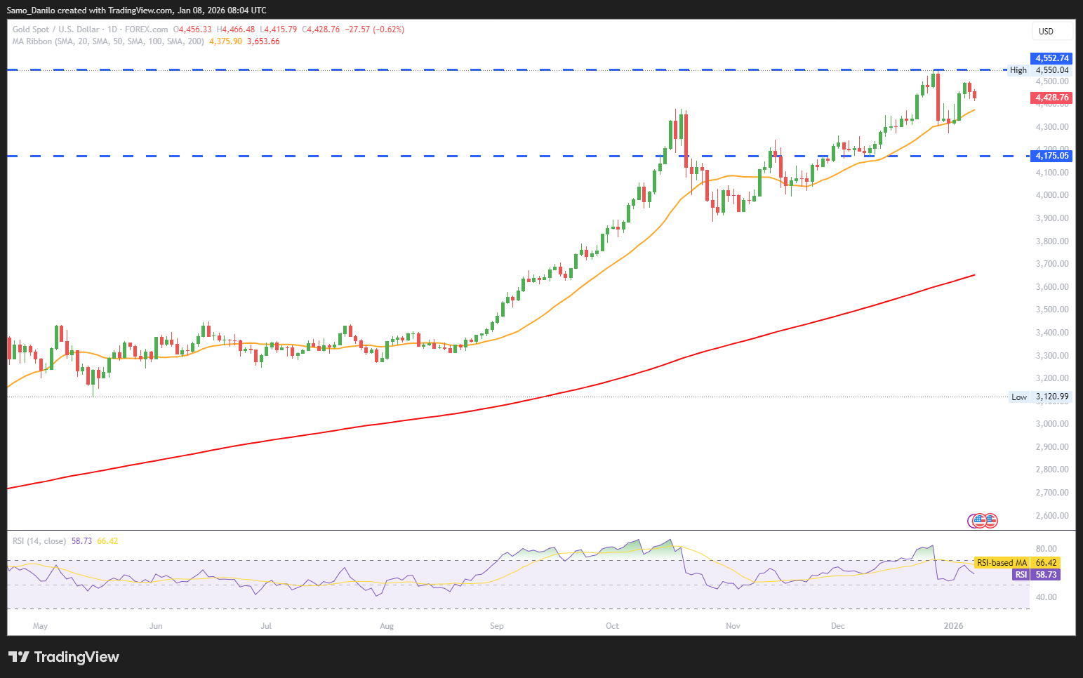 - XAU/USD Price: Gold is under selling pressure for a second consecutive session, sliding back toward $4,430 during European trading. The move reflects short-term profit-taking after recent record highs rather than a structural shift in trend.
