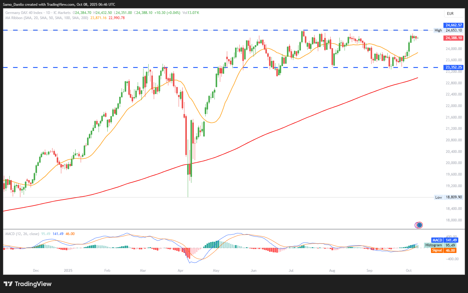 - DAX Price: The DAX remains range-bound, trading between 24,250 and 24,500 points since Thursday, reflecting stagnation at high levels. Investor sentiment appears cautious amid mixed economic and geopolitical signals.
