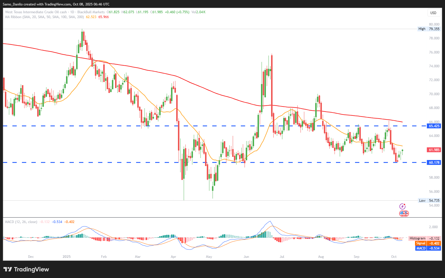 - Crude Oil Price: West Texas Intermediate (WTI) extended its modest recovery, trading near $61.95 per barrel in early European hours, slightly up from Tuesday’s close at $61.74. The move reflects cautious optimism as supply dynamics shift and traders assess demand-side risks.