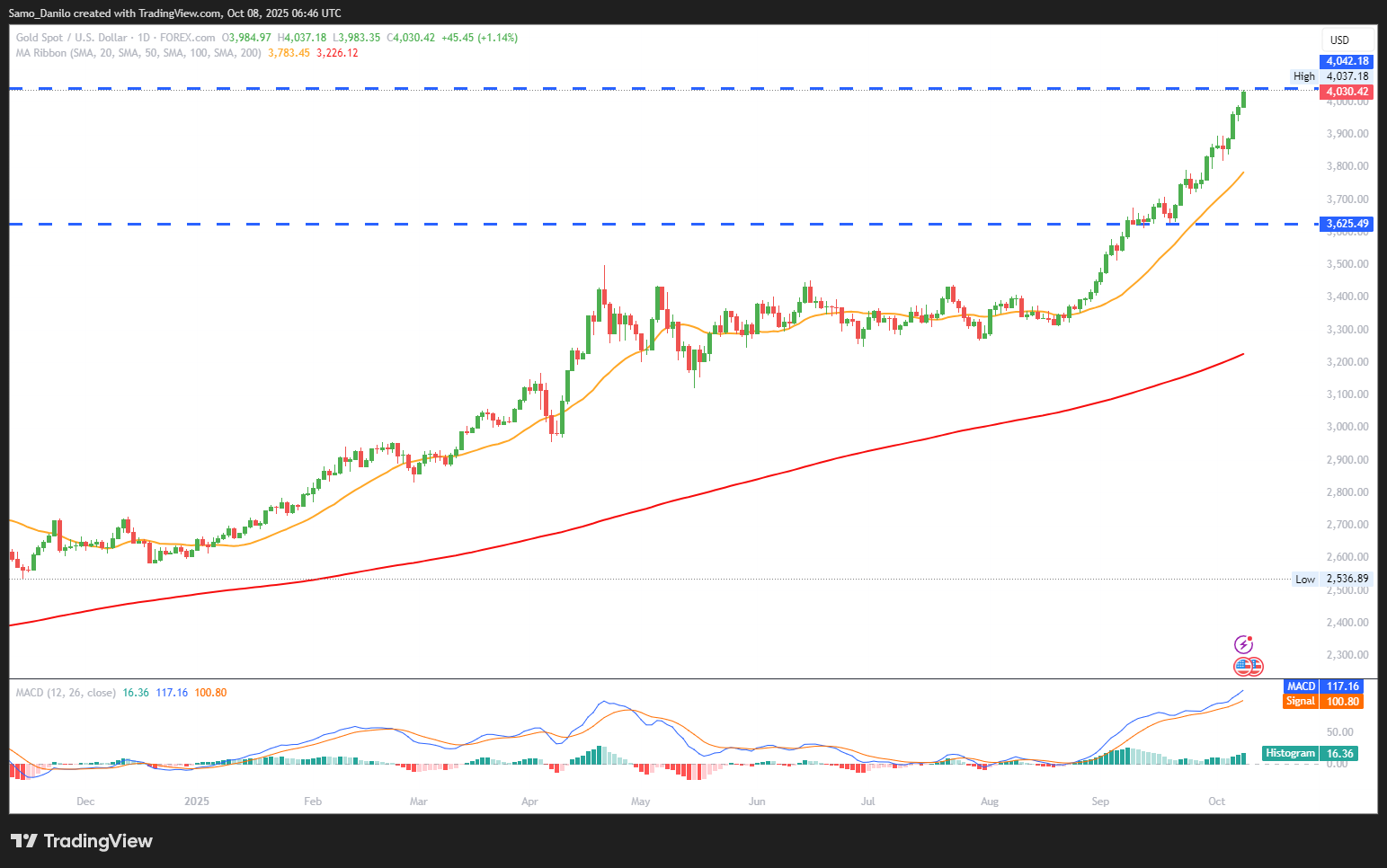 - XAU/USD Price: Gold (XAU/USD) extended its bullish run, trading around $4,030 per ounce and setting a new all-time high. The rally reflects a combination of inflation concerns, central bank demand, and expectations of a dovish Fed shift later this month.