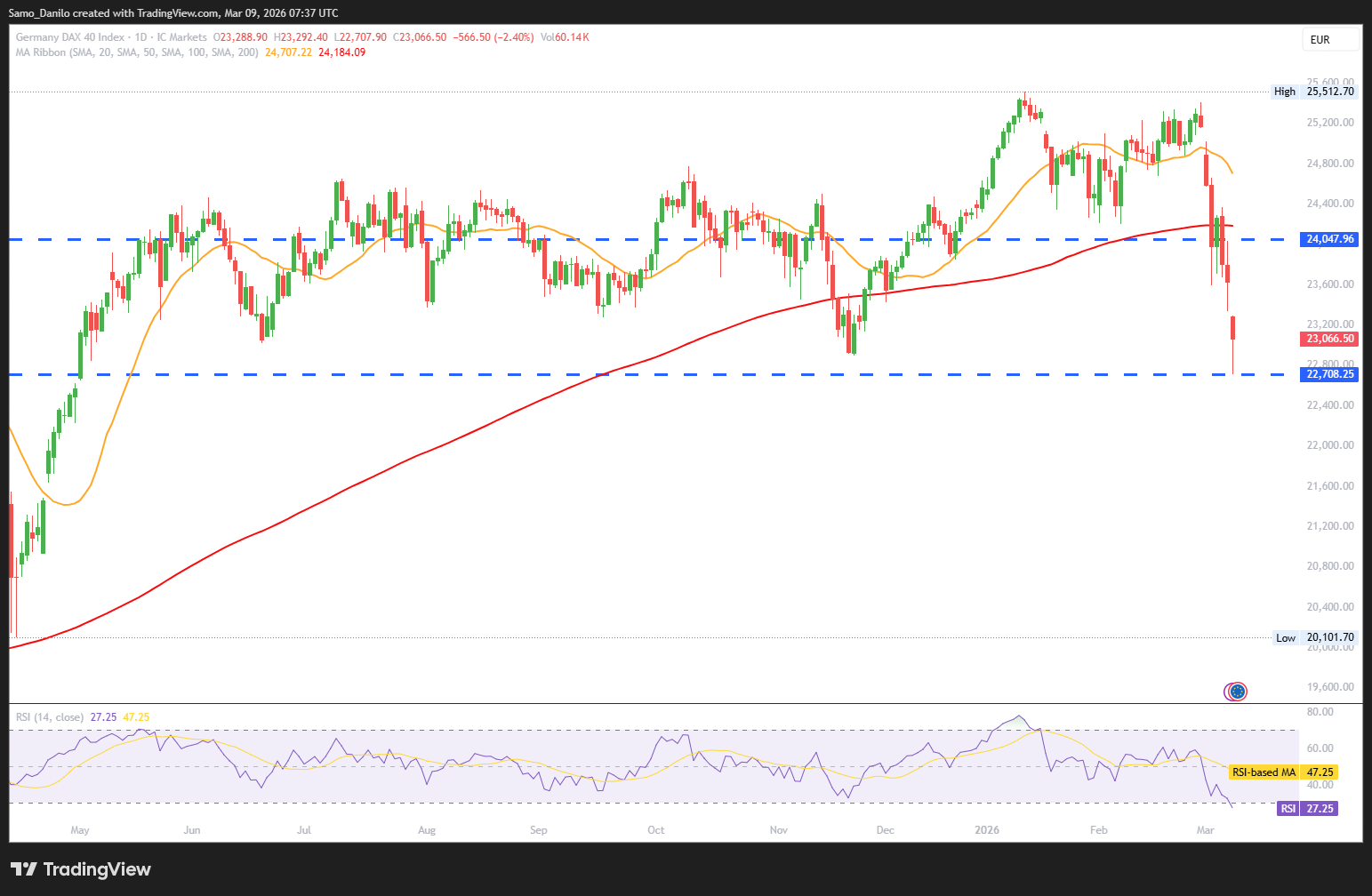 - DAX Price: The DAX faced strong selling pressure as European markets reopened after the weekend, briefly falling below the 23,000-point level, its lowest level since November 2025, before recovering somewhat. The sharp move reflects investor concerns about geopolitical risks and weakening economic indicators in Europe.