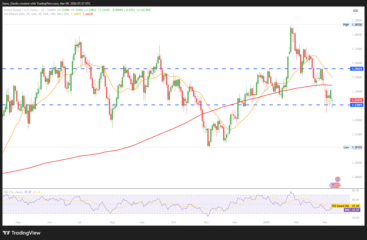 - GBP/USD Price: The GBP/USD pair is trading lower around 1.3310 during the early European session on Monday. The move reflects renewed demand for the US Dollar, driven primarily by heightened geopolitical uncertainty.