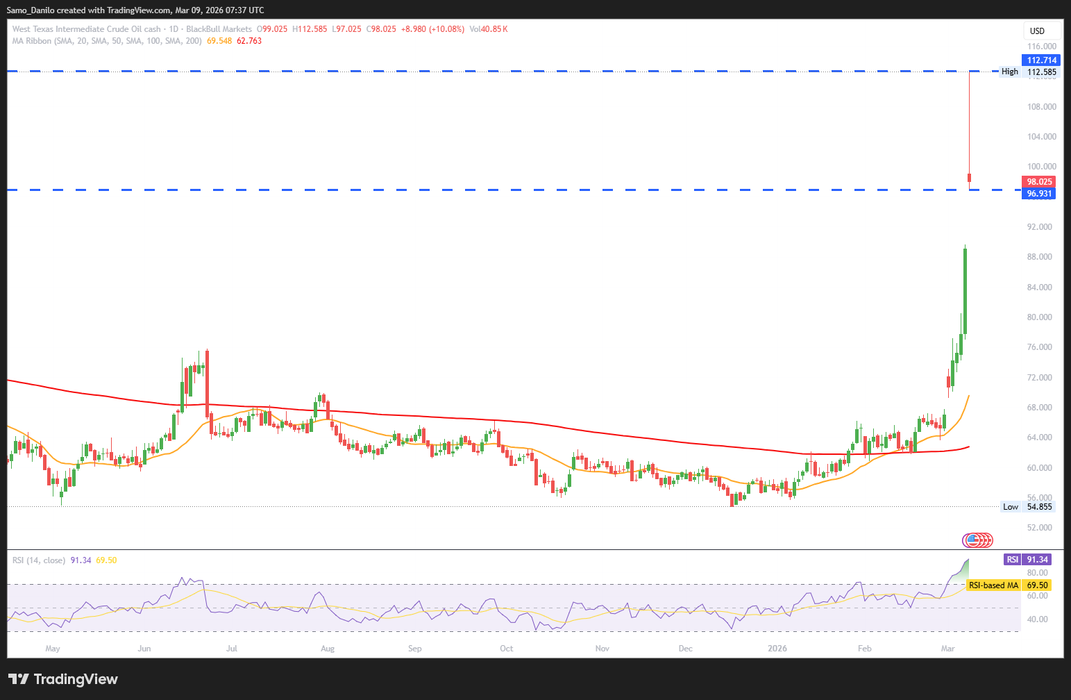 - Crude Oil Price: The Crude Oil market experienced extreme volatility, briefly surging above the key $100 psychological level and reaching highs near $117 before retreating below $100. Prices have climbed more than 25% since the start of the Middle East conflict, reflecting growing fears of significant supply disruptions.
