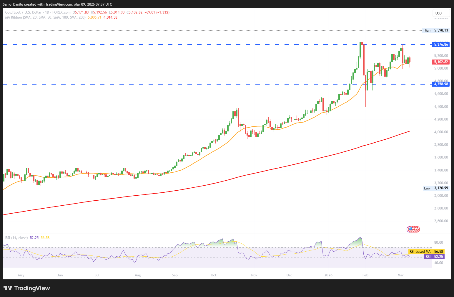 - XAU/USD Price: The XAU/USD pair has recovered slightly from its session lows but remains under pressure at the start of the week, trading around $5,100. Strong gains in Crude Oil prices amid escalating Middle East tensions are dominating market sentiment and influencing broader commodity markets.