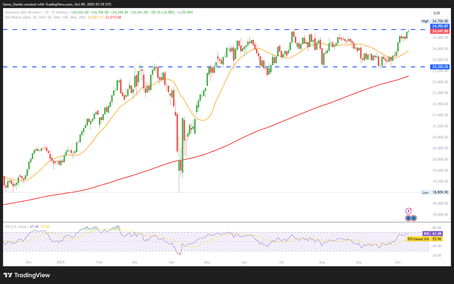 - Technical Outlook: From a technical standpoint, the DAX’s structure appears constructive. The long-standing resistance zone near 24,650 has acted as a ceiling for months. A sustained breakout above this level could trigger short-covering and momentum buying, potentially propelling the index toward the next key target at 25,000 points.