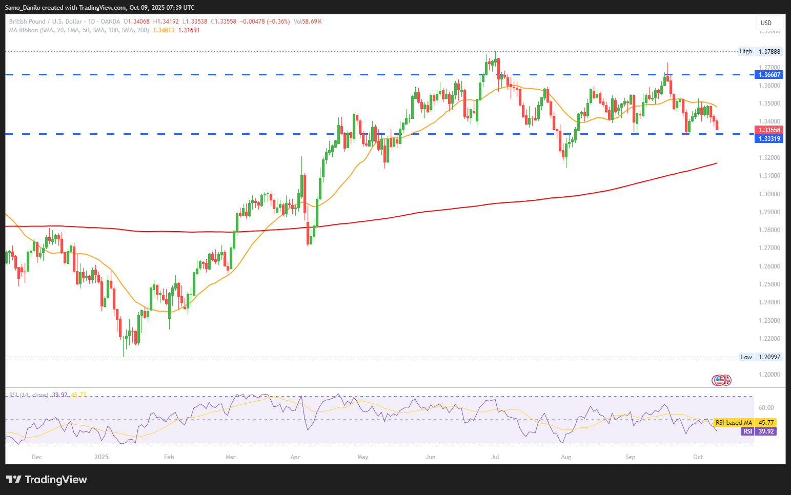 Closing statement: The Pound remains pressured, weighed by BoE caution and global financial market risks, while the prolonged US government shutdown continues to distort sentiment. Near-term direction will hinge on Fed-related developments and UK inflation data, with the pair likely to remain range-bound below 1.34 until fresh catalysts emerge.