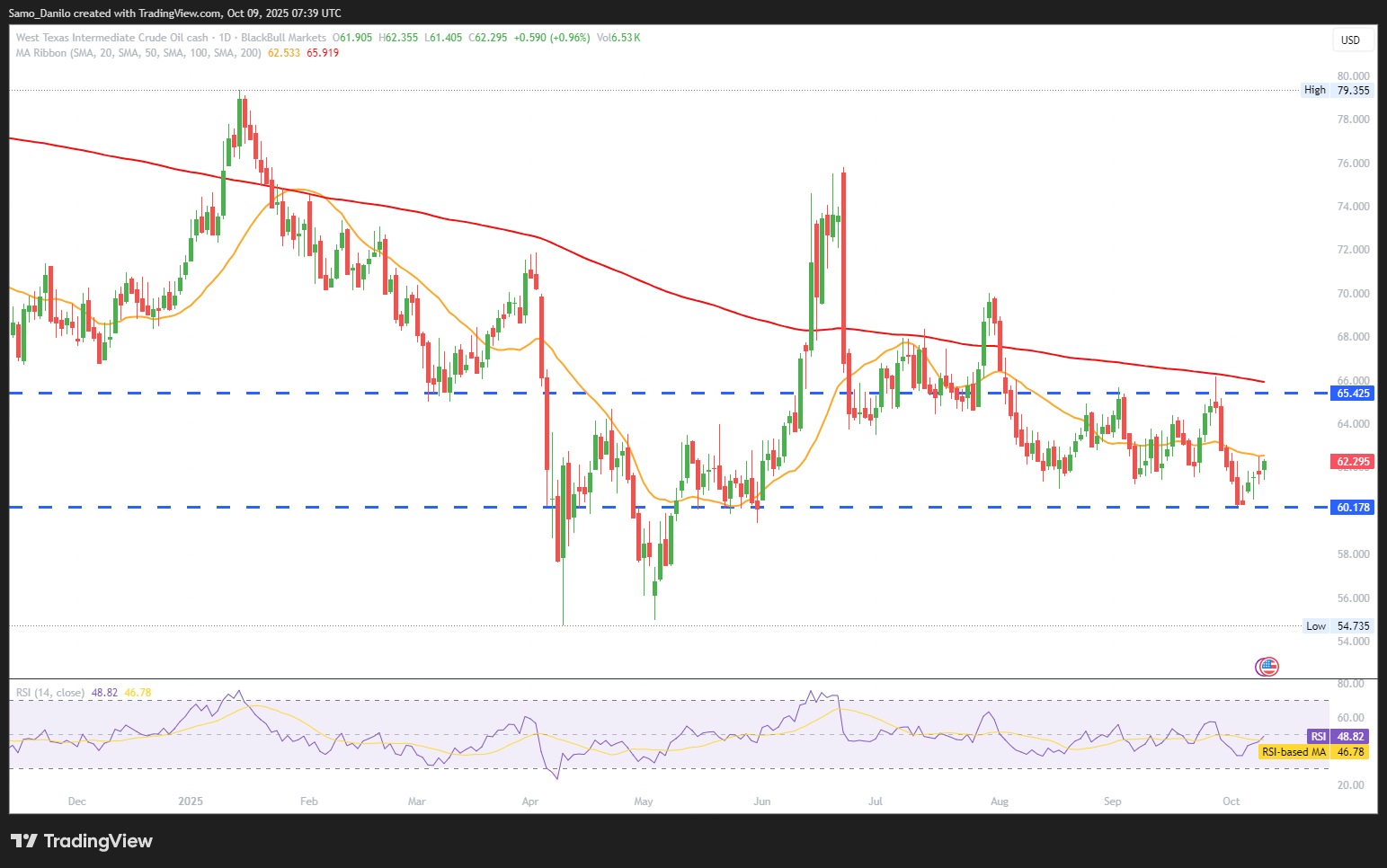 Closing statement: WTI remains range-bound near $62 as traders weigh rising US inventories against solid consumption data. With OPEC+ output creeping higher and sentiment turning bearish, the market may face renewed downside pressure unless evidence of sustained demand recovery emerges in the coming weeks.
