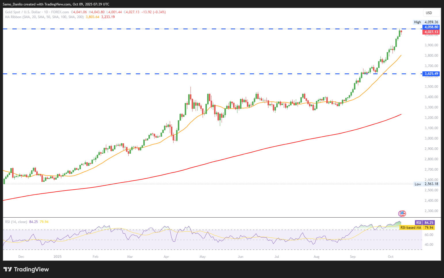 - Fed Minutes: Minutes from the Fed’s September meeting indicated that a majority of policymakers supported the latest rate cut and signaled openness to further easing later this year. The dovish tone bolstered demand for non-yielding assets such as gold, reinforcing its upside momentum around record levels.