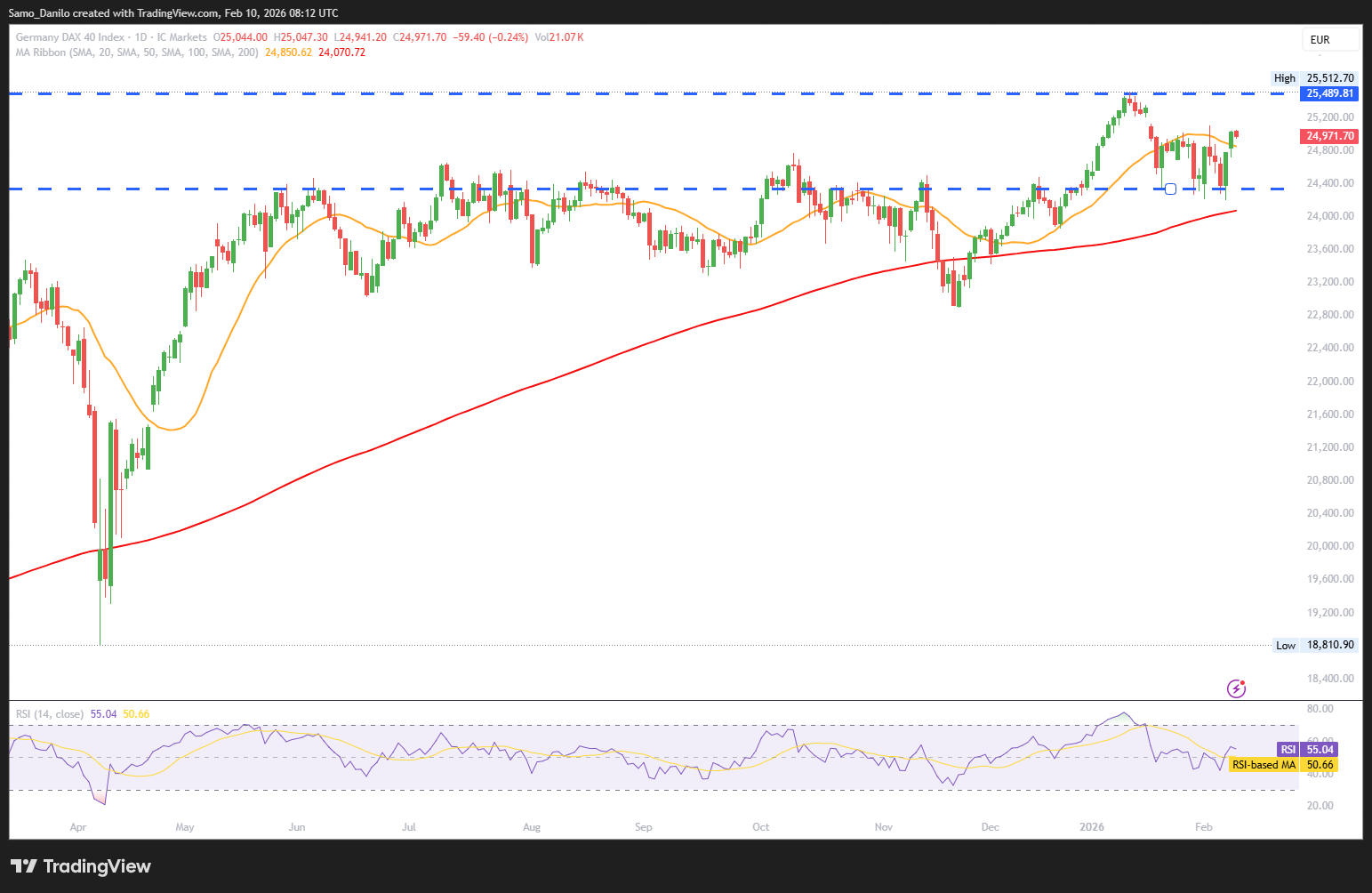 - DAX Price: The DAX is hovering around 25,020 points and is expected to initially struggle near the 25,000 psychological and technical barrier, a level that could cap near-term gains.
