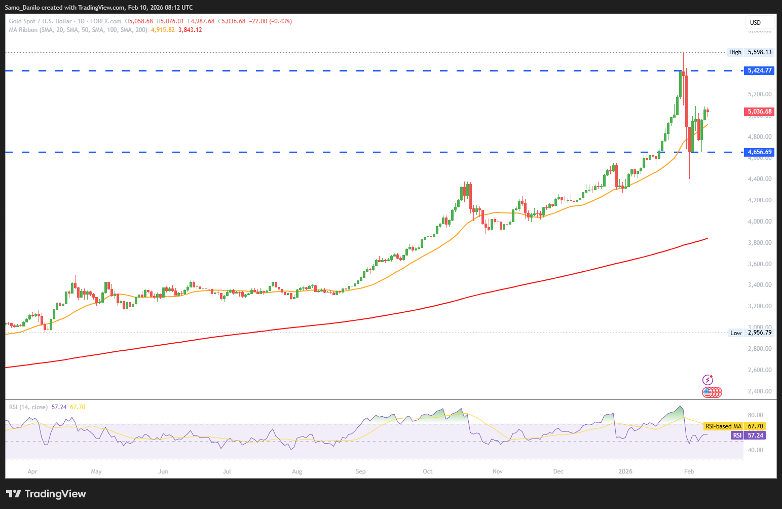 - XAU/USD Price: Gold eases during the European session, ending a two-day rally, but downside remains contained as prices hold below yet close to the $5,000 psychological level.