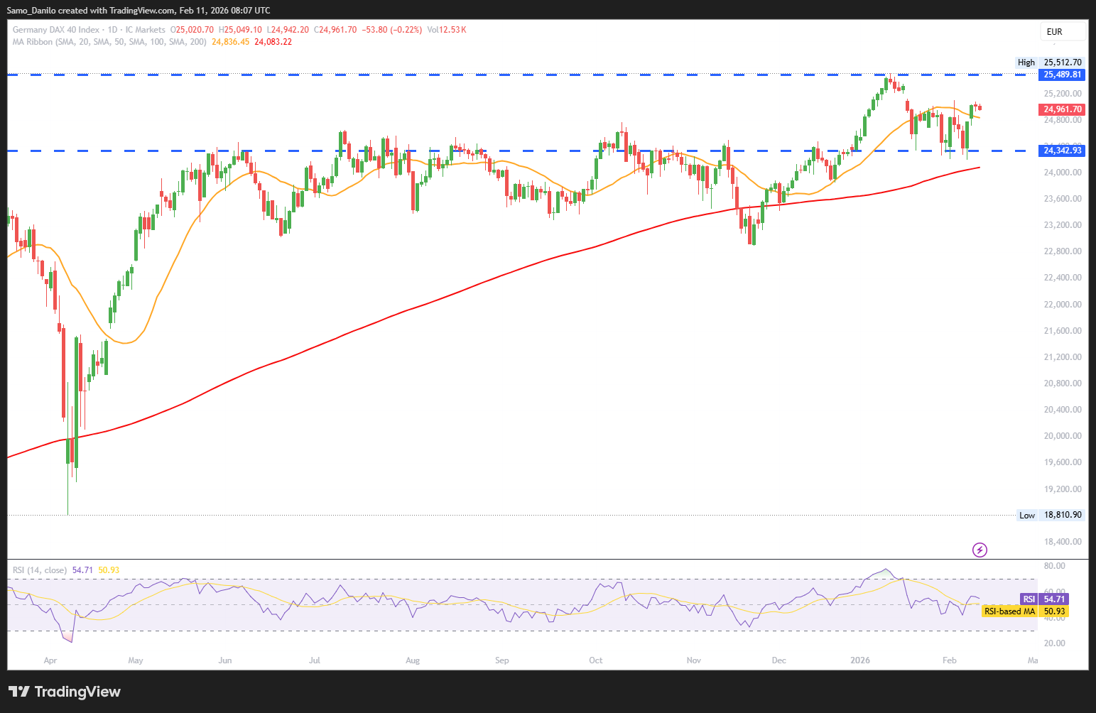 Closing statement: The DAX remains technically fragile near 25,000, supported by strong corporate earnings but increasingly constrained by structural cost pressures and weakening domestic investment appetite. A clear break above resistance would require broader confidence in Germany’s growth outlook, while sustained weakness below this zone could invite deeper corrective pressure.