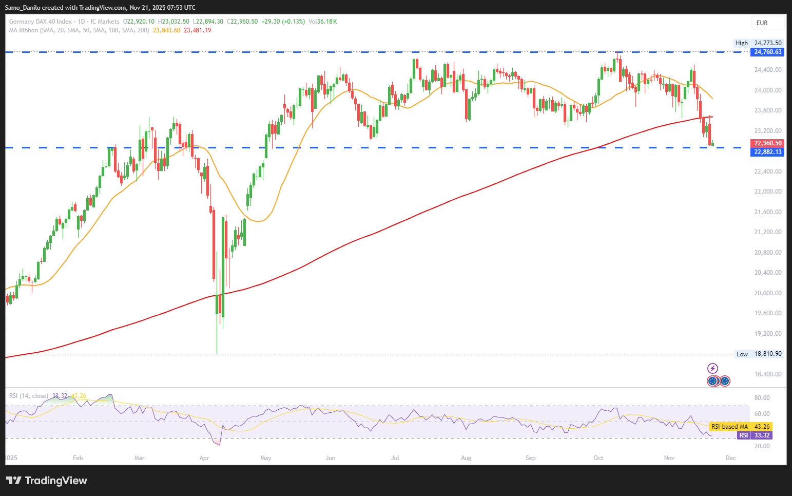 Closing statement: The DAX enters the weekend under pressure as weaker sentiment, structural industrial issues, and cautious macro signals dominate. Short-term direction will depend on PMI results and global risk appetite, with downside risks still prevailing.