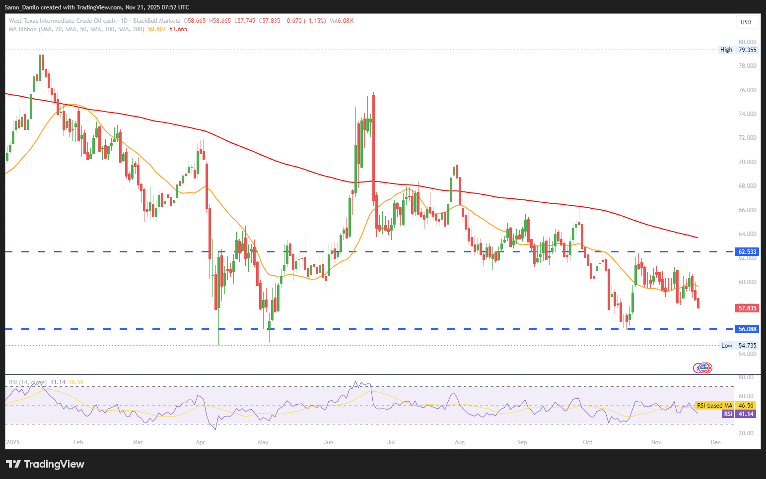 - Crude Oil Price: West Texas Intermediate extends its decline early Friday in Europe, retreating from Thursday’s close at $58.66. The bearish momentum reflects shifting geopolitical expectations and a softer risk tone.