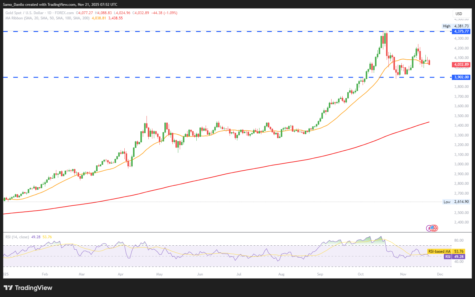 - Geopolitical Developments: Ukraine’s President Zelenskyy signaled willingness to negotiate under the US-backed 28-point peace plan, implying potential de-escalation. Reduced geopolitical risk weakens safe-haven flows into gold.