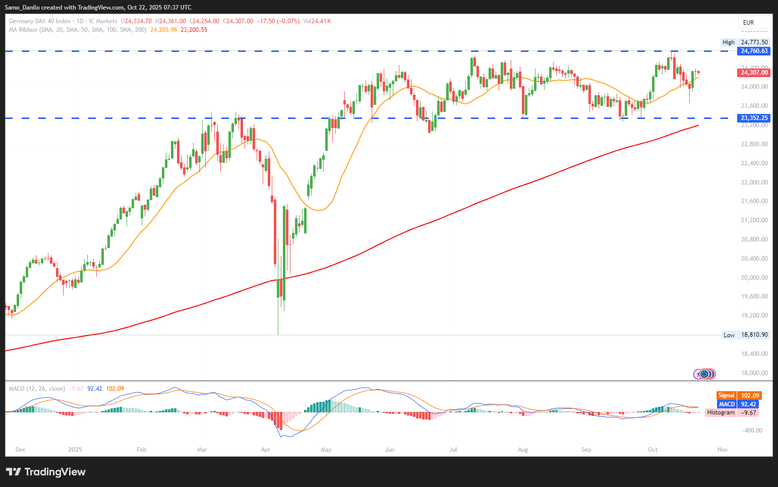 Closing statement: The DAX’s resilience above 24,000 reflects robust earnings and government support for industrial recovery, though rising insolvencies and economic headwinds remain key risks. Market attention now turns to SAP’s results for signals on corporate momentum heading into year-end.