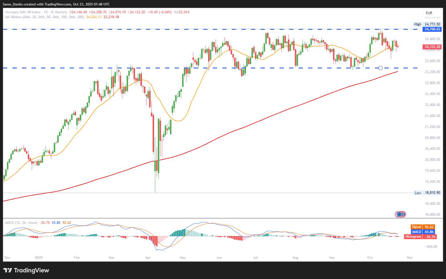 - DAX Price: The German benchmark index falls to around 24,110 points, extending Wednesday’s losses as investor sentiment remains fragile amid disappointing corporate results and a cautious global outlook.