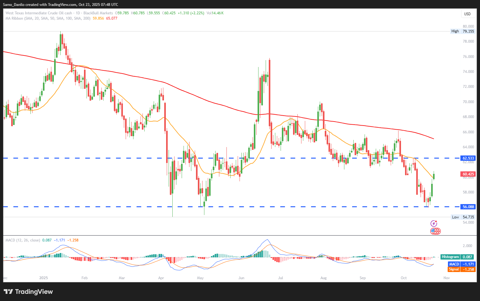 Closing statement: WTI crude remains supported above $60 by geopolitical risk and policy uncertainty, though long-term oversupply projections temper bullish enthusiasm. The market’s next directional cue will likely depend on developments in U.S.–Russia relations and progress on ending the government shutdown.