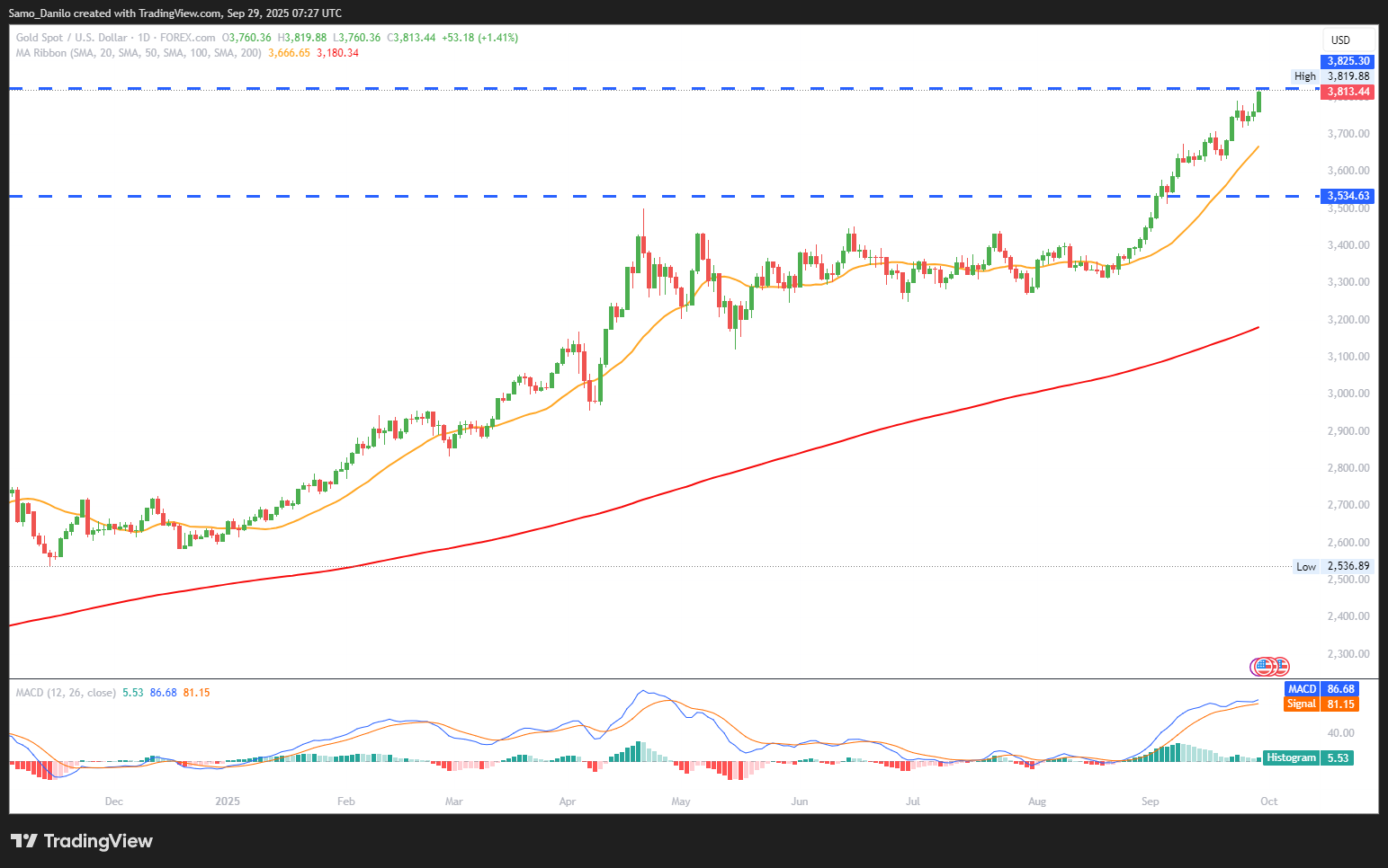 - XAU/USD Price: Gold extends its rally, hitting fresh record highs above $3,800 in early European trading on Monday, as safe-haven demand strengthens.