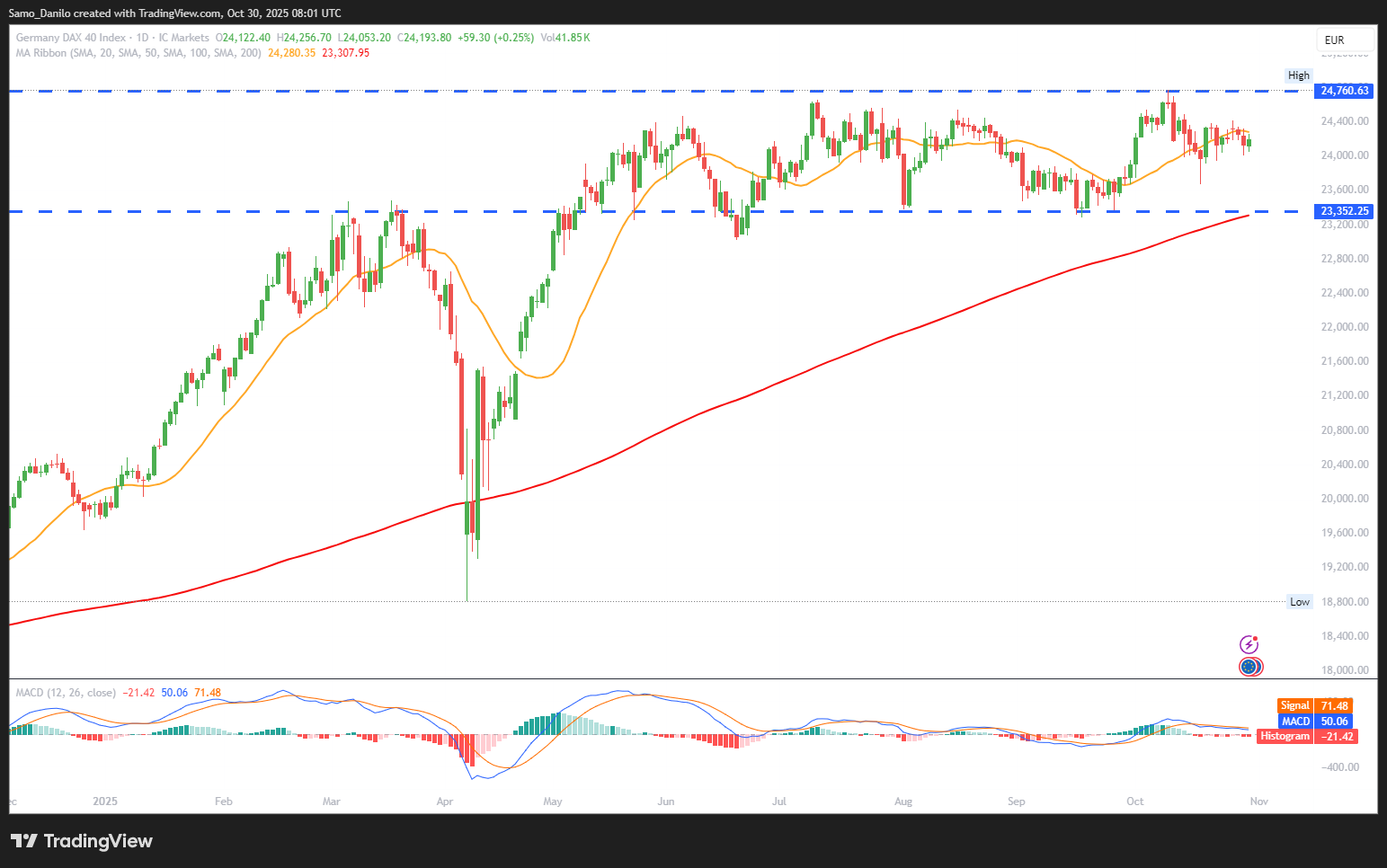 - DAX Price: Germany’s leading index, the DAX, trades 0.3% higher around 24,200 points, reflecting cautious optimism as investors digest fresh corporate earnings and geopolitical developments.