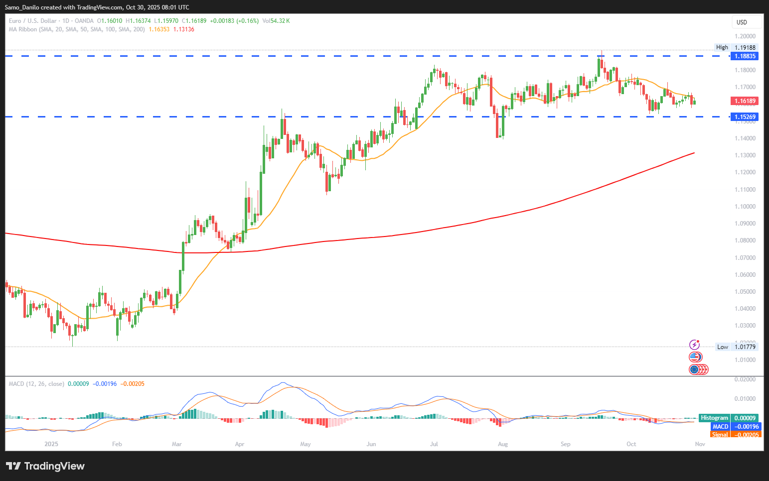 Closing statement: The EUR/USD remains supported near 1.1620, with traders balancing between a steady ECB stance and recent Fed dovishness. Economic data and Lagarde’s tone in the post-meeting remarks will determine whether the pair sustains momentum or faces renewed selling pressure.