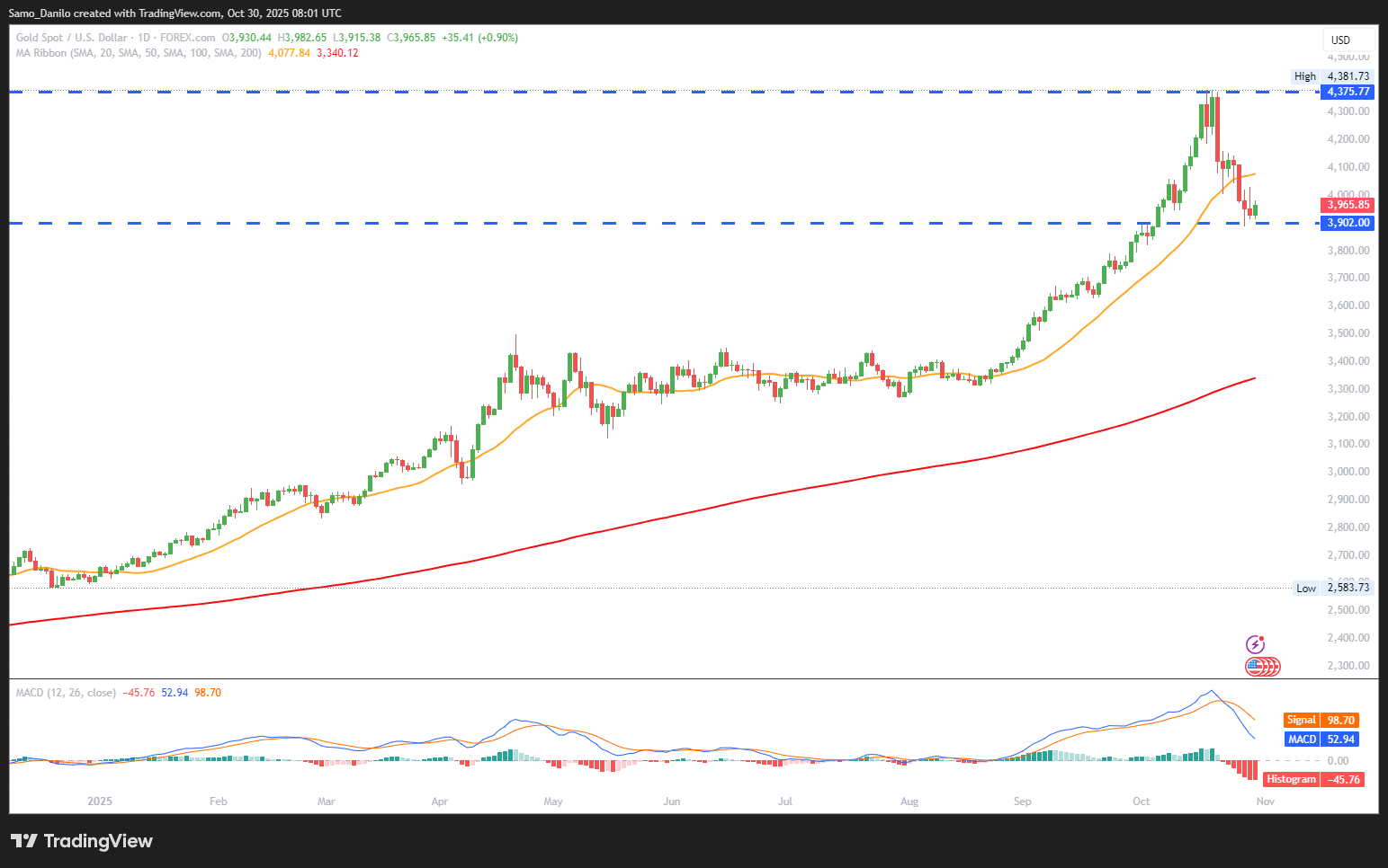 Closing statement: Gold holds just below $4000 as mixed Fed signals and US political risks balance improving US–China relations. While the end of quantitative tightening lends a medium-term bullish undertone, delayed rate-cut expectations may restrain near-term upside momentum.