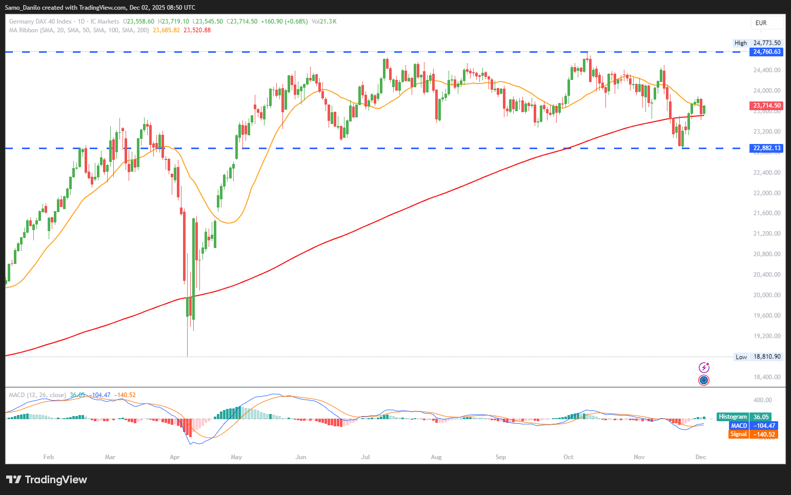 - DAX Price: Germany’s DAX 40 index hovers around 23,680 points, reflecting restrained market appetite as investors digest mixed domestic data. The index remains in a consolidation phase with downside risks tied to weakening fundamentals.