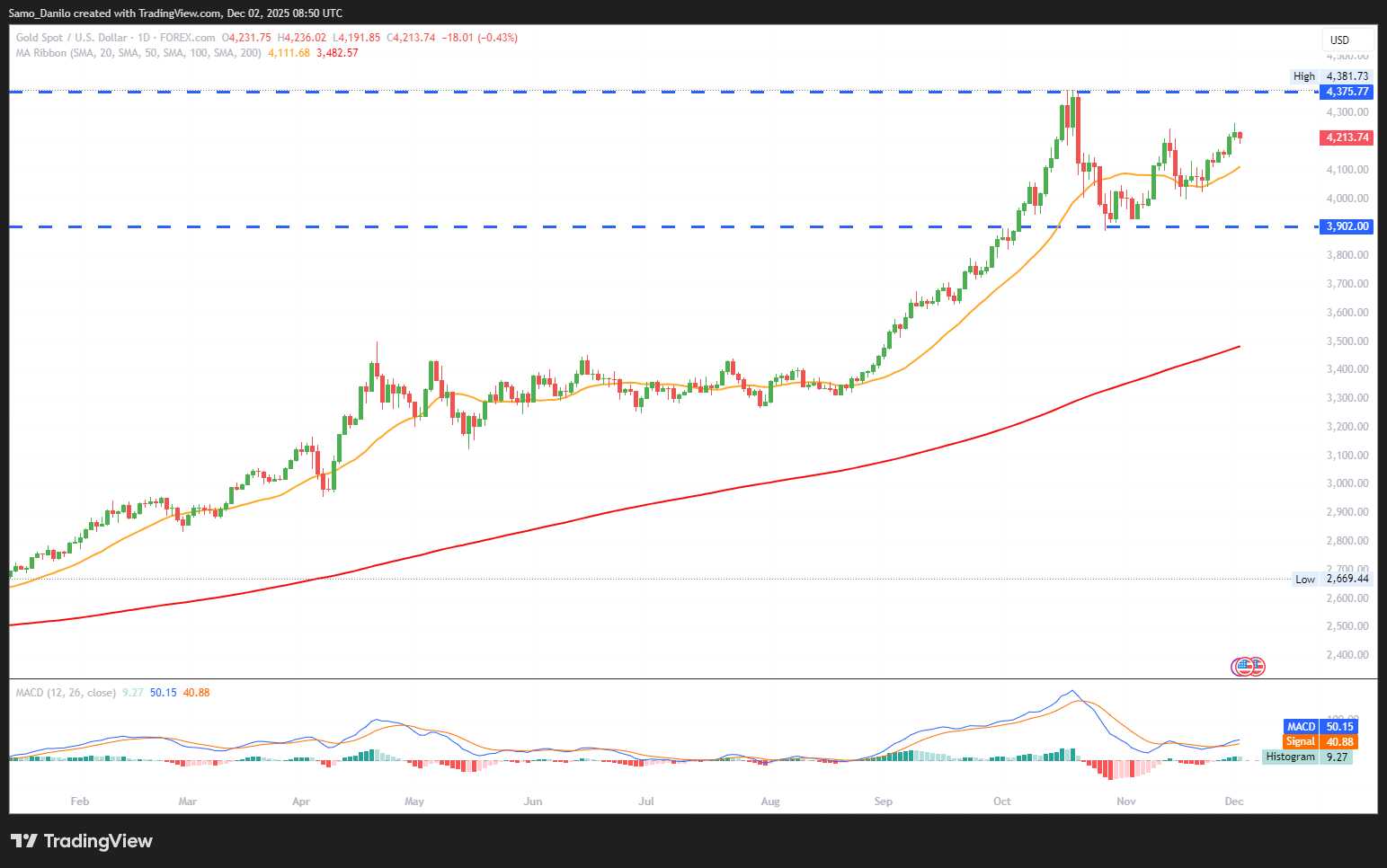 - XAU/USD Price: XAU/USD briefly fell below $4,200 during the Asian session but quickly recovered most losses. The metal continues to trade just under its strongest level since October 20, supported by underlying safe-haven demand.