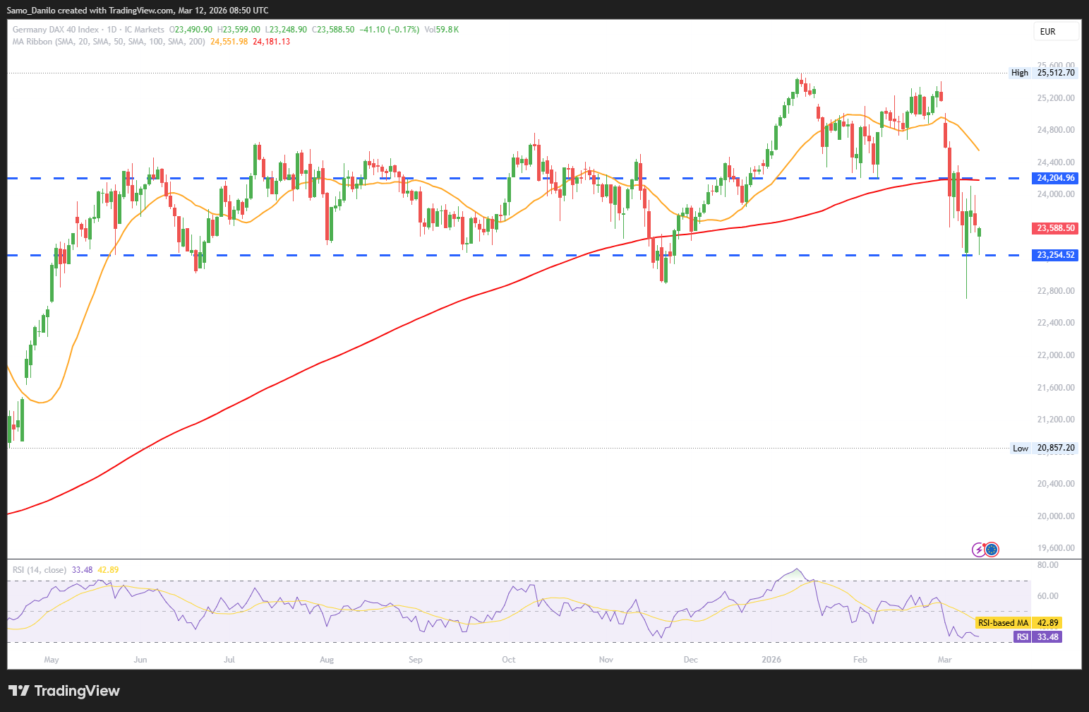 Closing statement: The DAX remains under pressure from geopolitical risks and rising energy costs, while corporate outlooks and potential fiscal responses in the Eurozone will likely shape investor sentiment in the near term.
