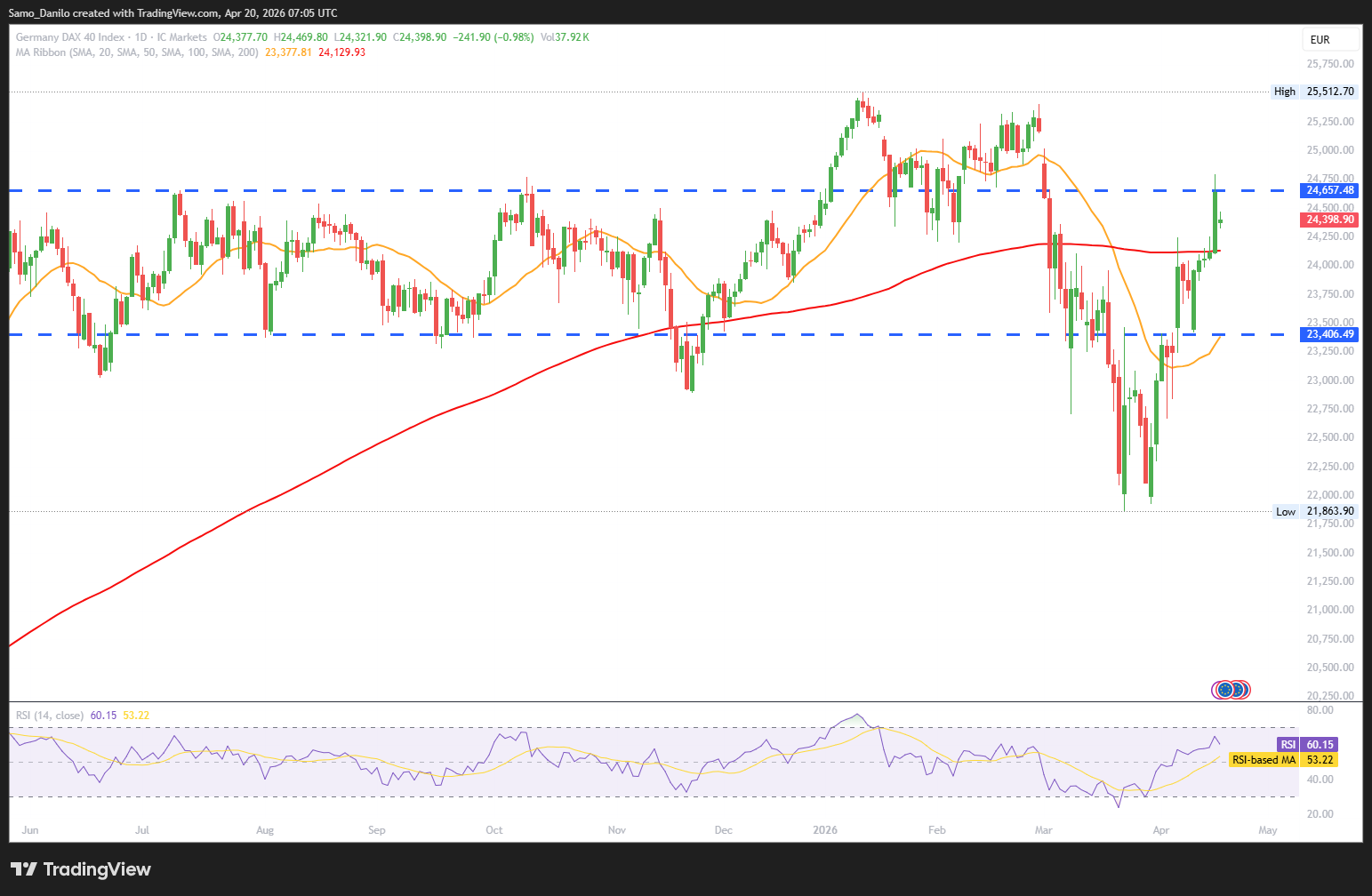 Closing statement: The DAX is under mild pressure as geopolitical risks and mixed economic data weigh on sentiment, despite supportive corporate developments. The near-term outlook remains cautious, with direction dependent on inflation trends and central bank signals.