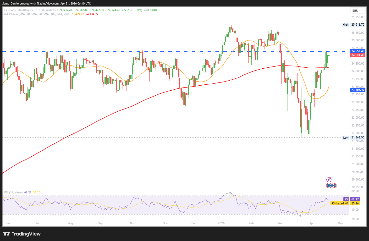 - DAX 40 Price: Following Monday’s decline, the DAX is showing signs of recovery, trading around 24,510 points. This indicates a tentative rebound, with investors cautiously re-entering the market after recent selling pressure.