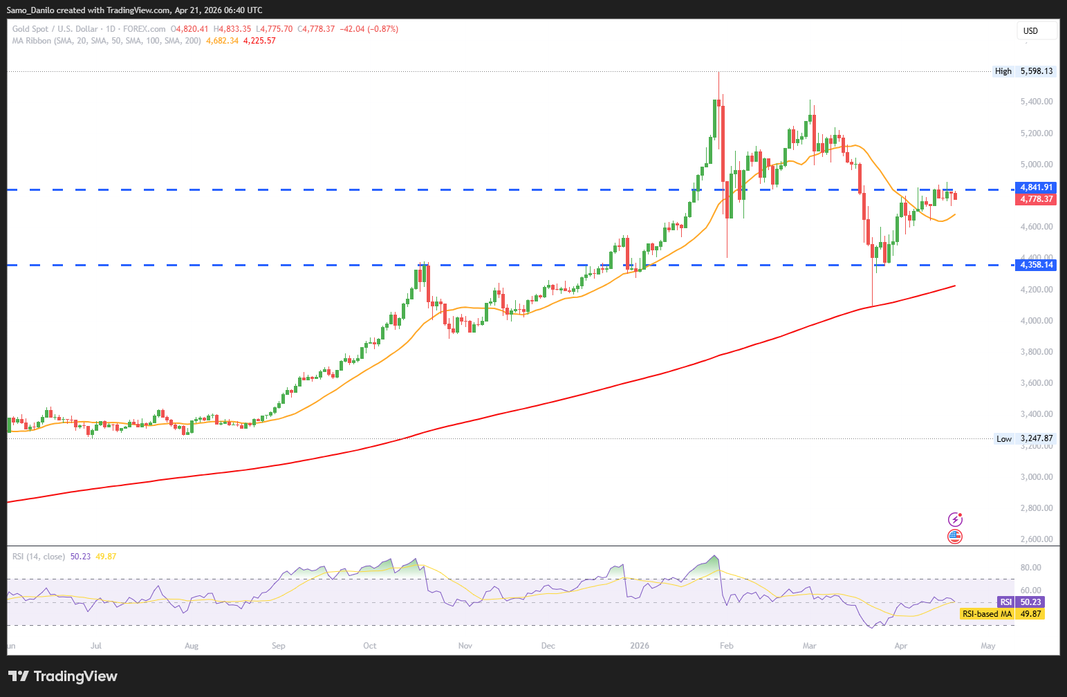 - XAU/USD Price: Gold is extending its intraday decline and has fallen below the $4,800 level, reversing part of the previous session’s recovery. This indicates that bearish momentum is re-emerging, with sellers regaining short-term control.