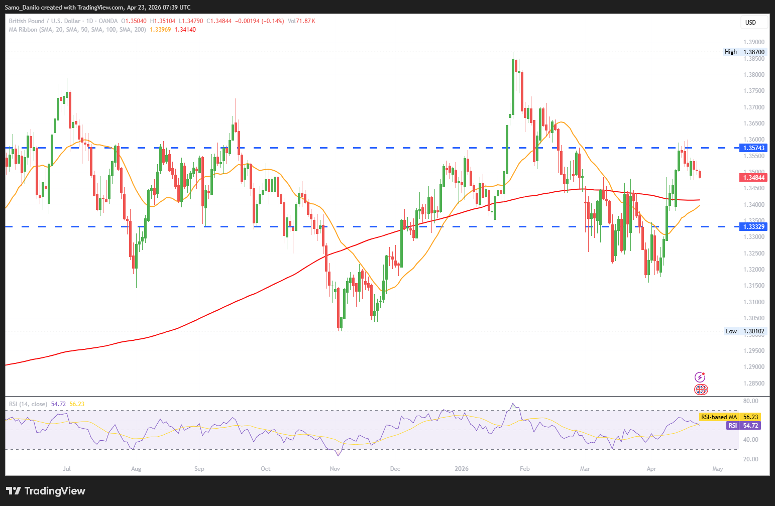 - GBP/USD Price: GBP/USD remains under pressure for a third consecutive session, trading around 1.3490. This indicates persistent bearish sentiment, with limited buying interest in the near term.
