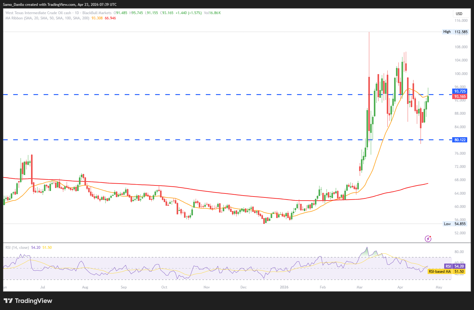 - Crude Oil Price: WTI crude is extending gains for a third consecutive session, trading around $93.20 per barrel. This continued upward movement reflects strong bullish momentum, driven by persistent supply concerns.