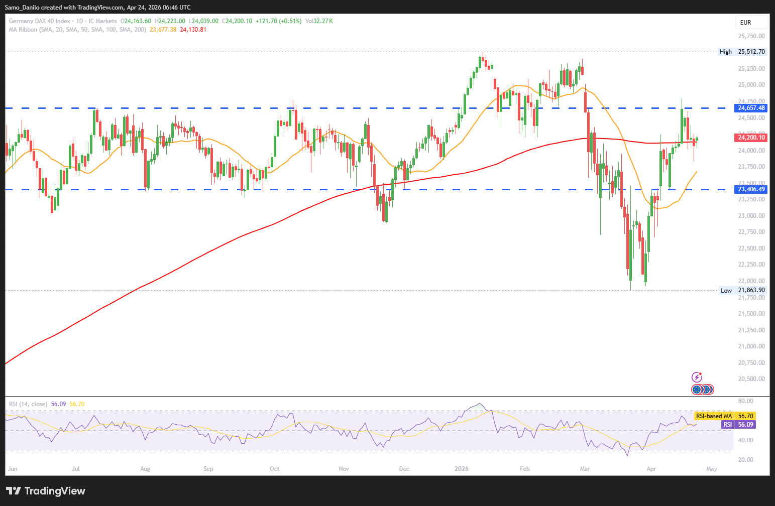 - DAX 40 Price: The DAX is trading about 0.5% higher near 24,200 points, indicating a short-term recovery. However, the upside appears limited as broader macroeconomic concerns continue to weigh on sentiment.