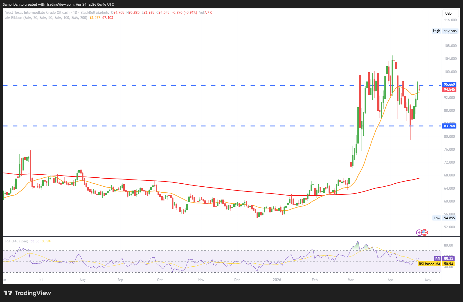 - Crude Oil Price: WTI is trading around $95, consolidating just below a two-week high near $97. This indicates strong bullish positioning, with prices holding elevated levels after a significant rally.